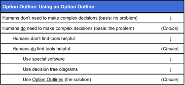 Studies have shown that critical thinking test scores increase when using "argument mapping" software with boxes and arrows that help us keep track of prior decisions. While there are several specialty applications available to visualize "tree" diagrams of options and choices, I prefer using a simple outline which shows just the chosen "branches." Anyone can be taught to make an outline, and no special software is needed. I call this design an Option Outline because it uses the structure of an outline, but shows the thought process of the options considered at each step. (Option Outline created by John Lewis, Ed.D.)