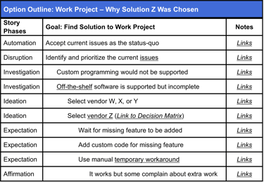 So, in the above Option Outline, we see the options considered, the choices made, and the progression of the thought process based on those choices. In this case, the basis was that humans do need to make complex decisions, and the final choice was that we should use Option Outlines to help us do just that.