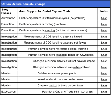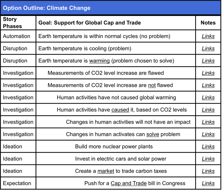 Using the topic of climate change, given it is well known and sufficiently complex, we can follow the thinking of how a bill becomes a law, with an Option Outline. The purpose here is not to debate the solution of cap and trade, but to show how an Option Outline can help untangle a compressed thought process, to keep our own thinking straight and provide transparency for others. If you support cap and trade, then you could create the links to the supporting data and reasons for choosing the options that created the thought process. You could probably list additional options that were considered. And if you are not for cap and trade, then you can create the links to the supporting data for the options that were not chosen.